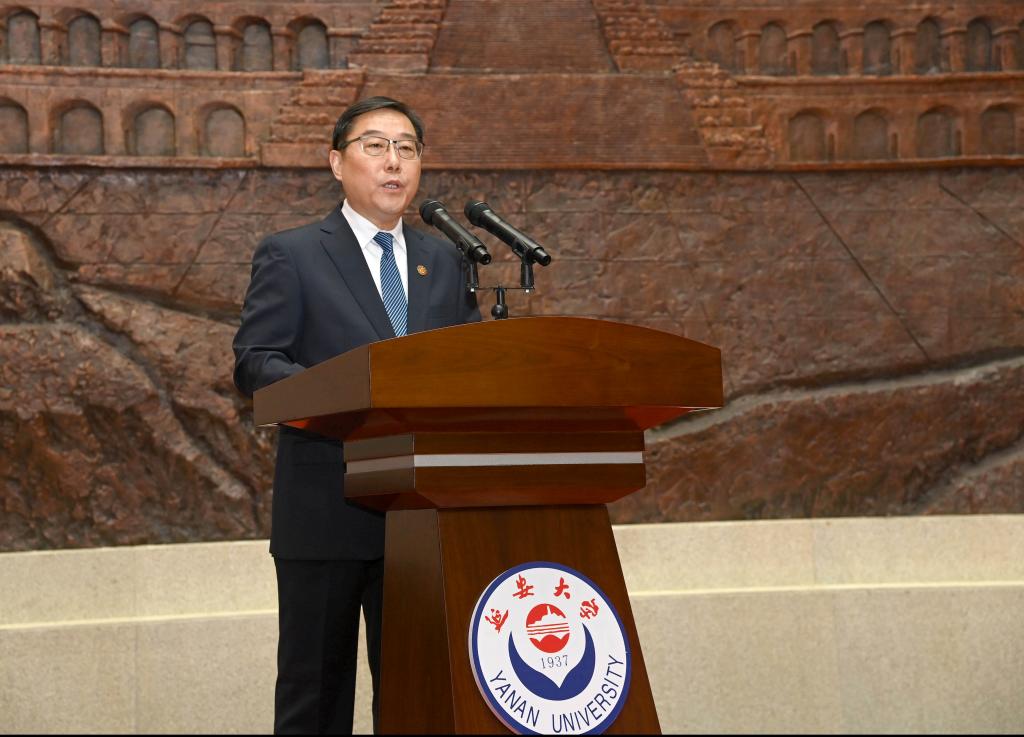 高子伟校长在致辞中回顾了我校校史馆的建设过程。他说,着眼新时代立德树人的新要求,2016年4月,我们启动了新校史馆建设,在建设过程中,各级政府和陕建集团给予了悉心指导和大力支持,师生员工纷纷建言献策,广大校友心系母校积极捐赠展品,广大校史人加班加点、调研论证,在各方面的共同努力下,新校史馆终于高标准、高质量建成。延安大学校史馆兼具中国共产党延安时期高等教育历史博物馆的功能,在全国校史馆中独树一帜,是历代党和国家领导人关心、支持、指导高等教育工作的集中展现,是党培养一代又一代知识分子不忘初心、建功立业的生动写照,是一代又一代延大人接续奋斗的实践缩影。新校史馆将成为宣传延大、宣传党的高等教育事业的重要窗口,成为全国红色教育高地,在培养具有延安精神特质、堪当民族复兴重任的时代新人过程中发挥校史育人功能。